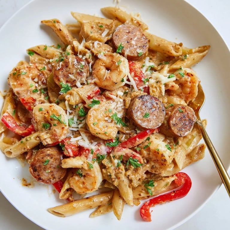 Save A creamy, spicy one-pan pasta featuring smoky sausage, succulent shrimp, and a rich Cajun Alfredo sauce—perfect for weeknight comfort.