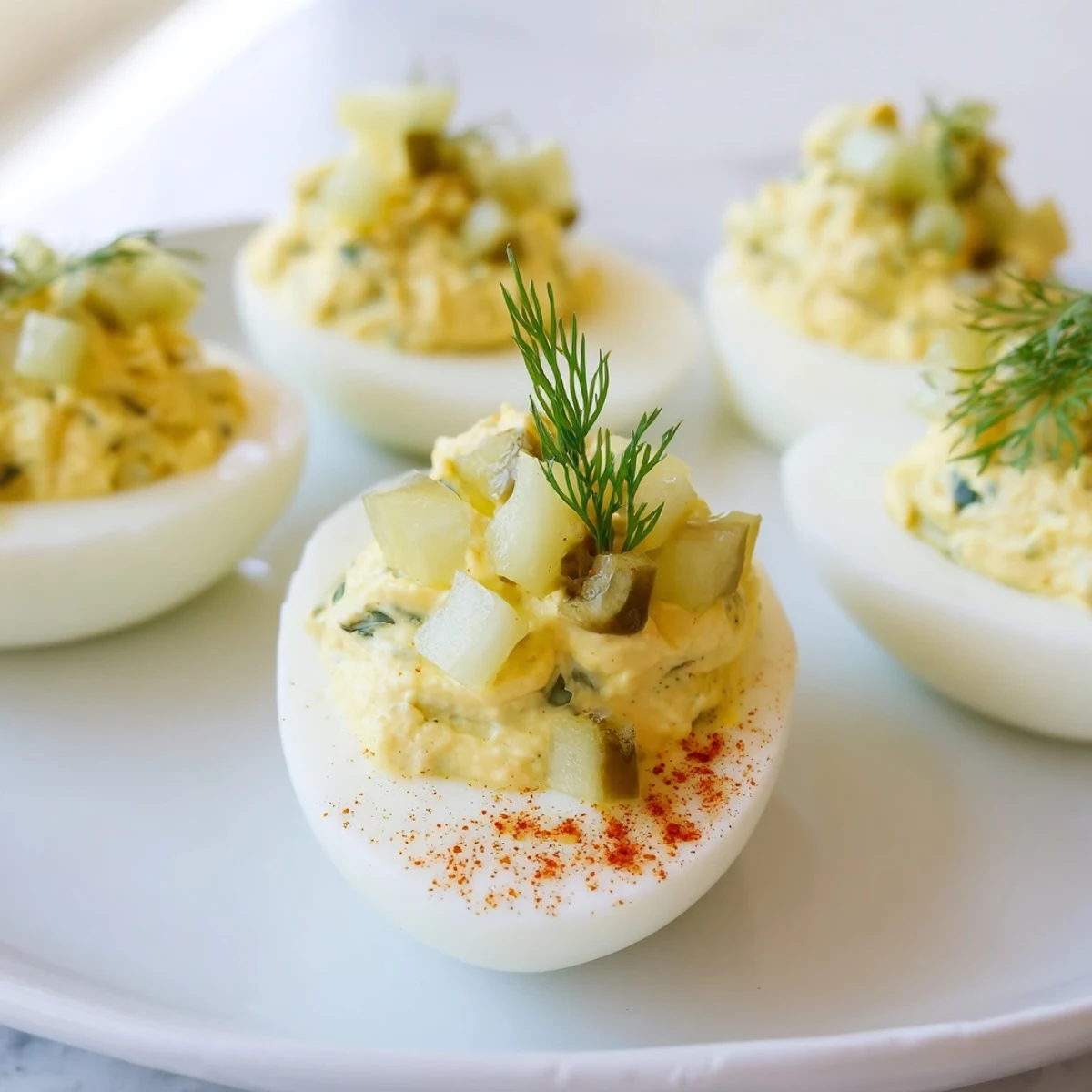 - Top each egg with a small piece of diced pickle, a light sprinkle of smoked paprika, and a tiny sprig of fresh dill. Serve them chilled for the best flavor and texture.