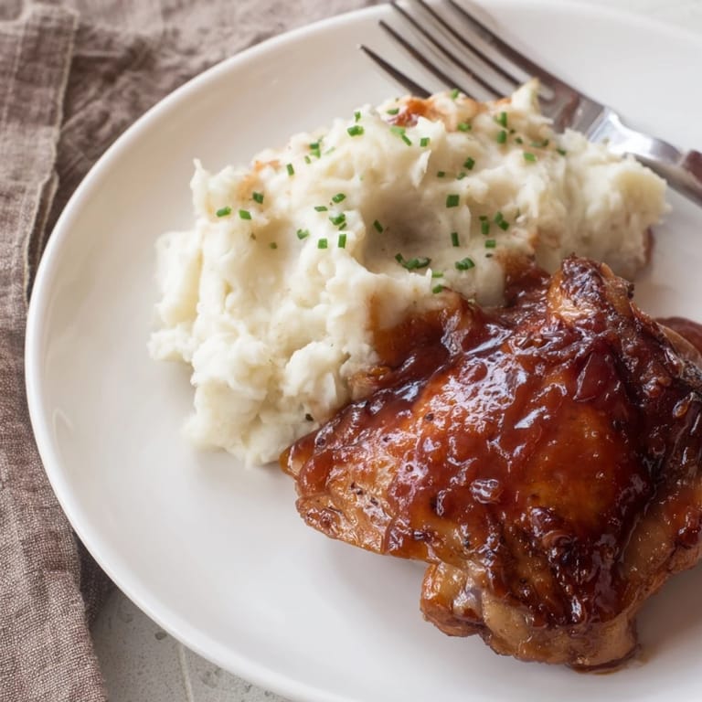 Save Succulent, oven-baked chicken thighs glazed in a sticky honey BBQ sauce, served with creamy garlic mashed potatoes for a comforting and flavorful meal.