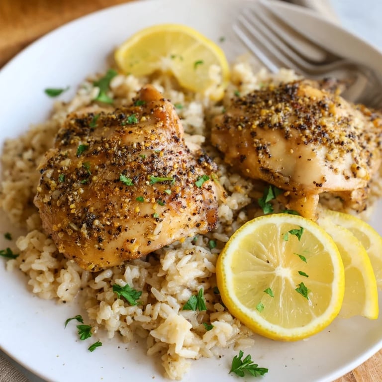 Save Succulent chicken breasts seasoned with zesty lemon and cracked black pepper are served over fluffy rice for a bright comforting meal. This dish offers a harmonious blend of fresh citrus and aromatic spices making it a family favorite any night of the week.