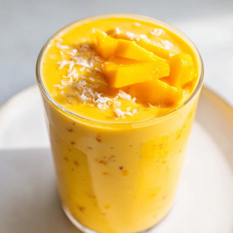 - Pour into glasses and garnish with mango slices, coconut flakes, or a tiny sprinkle of turmeric for color. Drink it right away while it's cold and frothy.