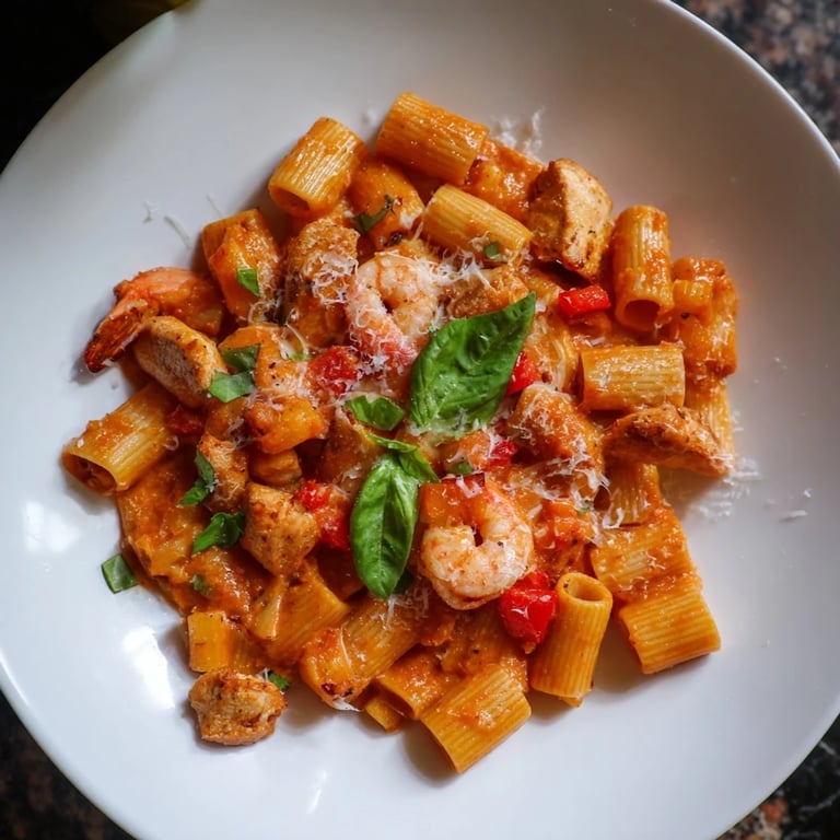 Mixing shrimp and chicken might seem unconventional, but they're actually ideal partners in a spicy tomato sauce. The chicken provides substance and protein-forward heartiness, while the shrimp add a briny sweetness that emerges when they're cooked in acidic tomato. Together, they create a dish that feels luxurious without being fussy, and the different textures keep every bite interesting rather than monotonous.