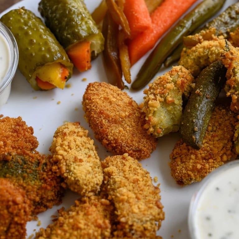 Save A tangy, crunchy feast featuring crispy fried pickles, a variety of pickled vegetables, and a playful twist with pickled-wrapped bites, perfect for true pickle enthusiasts.