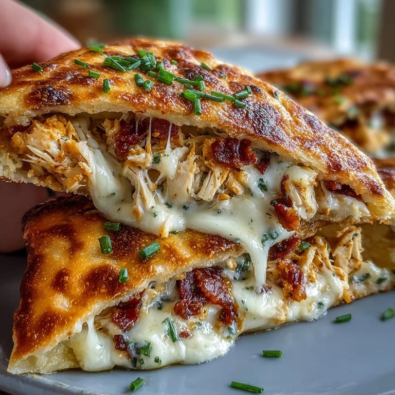 Save This recipe takes the beloved flavors of 'crack chicken' and stuffs them into large garlic naan breads, which are then brushed with extra garlic butter and grilled until golden and crispy. It is a hearty meal that contains meat and gluten, offering a satisfying crunch on the outside and a gooey, cheesy center.