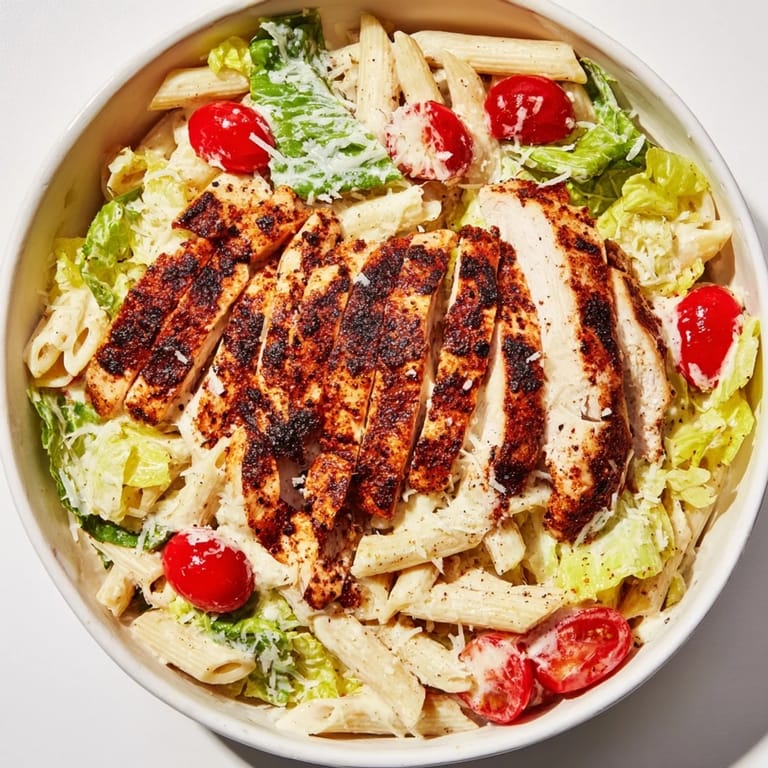 Save My neighbor Anna brought this over on a Tuesday night when I was too tired to think about dinner. The smell of paprika and garlic hit me before I even opened the container. She'd tossed spicy grilled chicken with pasta, Caesar dressing, and fresh romaine, and somehow it felt both indulgent and light at the same time. I ate it standing at the counter, and by the time I sat down, half the bowl was gone.