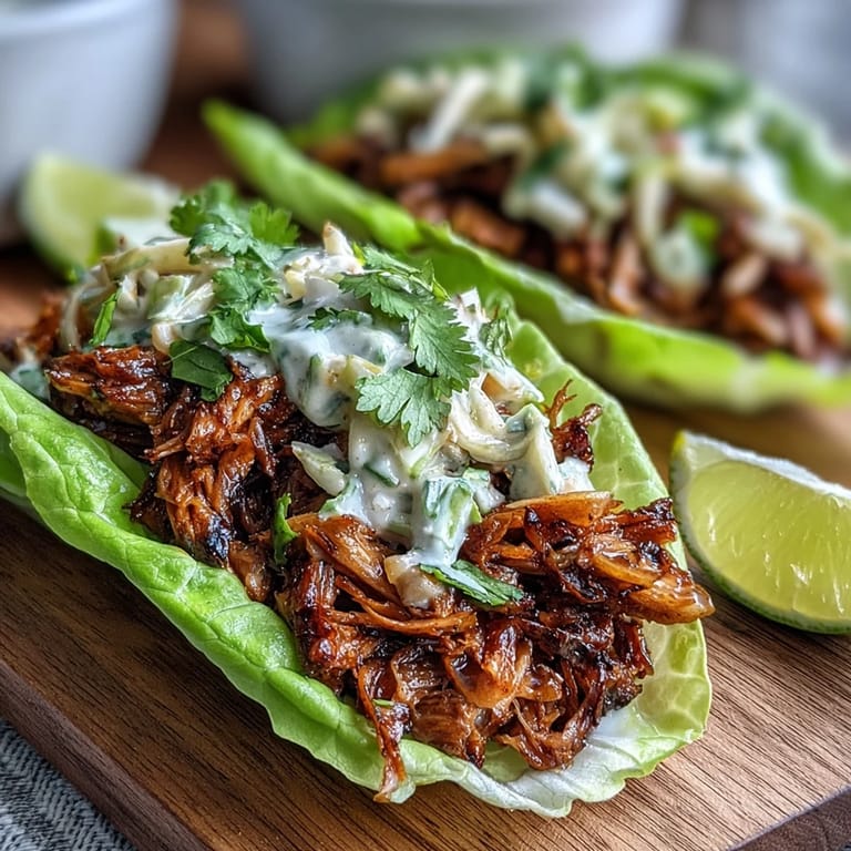Save Experience a refreshing plant-based twist on a classic favorite with these Vegan BBQ Jackfruit Lettuce Tacos. Tender jackfruit is slow-simmered in a rich, smoky BBQ sauce to achieve a texture that perfectly mimics pulled meat, then served in crisp butter lettuce cups for a light and satisfying meal. Topped with a tangy, creamy slaw, these tacos provide a delightful balance of flavors and textures in every bite.