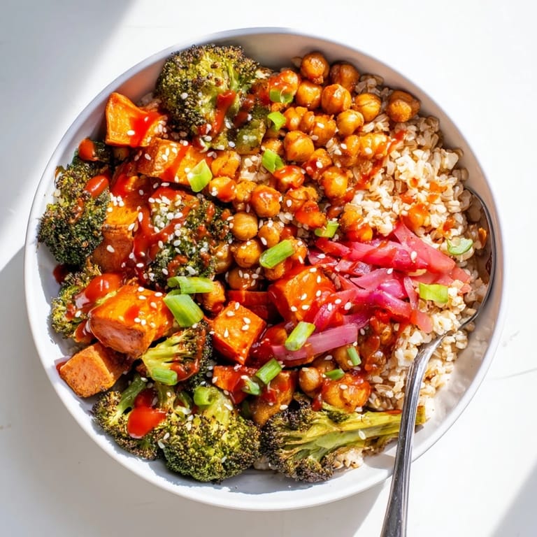 Experience vibrant grain bowls layered with a medley of roasted broccoli, sweet potato, and bell pepper, complemented by crisp chickpeas and your choice of grain. Each bowl is customizable with globally inspired sauces—silky miso-butter and spicy gochujang-maple—drizzled for an extra punch of flavor. Fresh green onions, sesame seeds, and pickled onion add texture and zing. The components come together in under an hour, easily adaptable for vegetarian or vegan diets and varied with favorite veggies or proteins, creating a satisfying meal fit for any day.