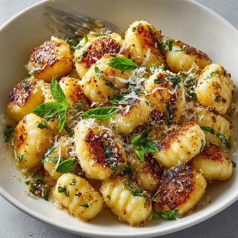 - Heat butter and olive oil in a large skillet over medium heat until butter melts and begins to foam. Add sliced garlic and cook for 30 seconds until fragrant but not browned. Add the boiled gnocchi to the pan and sauté for 2-3 minutes until they develop a light golden crust. Toss gently to avoid breaking. Plate the gnocchi, garnish with fresh basil leaves and additional grated Parmesan, then carefully place a Parmesan sail atop each serving.