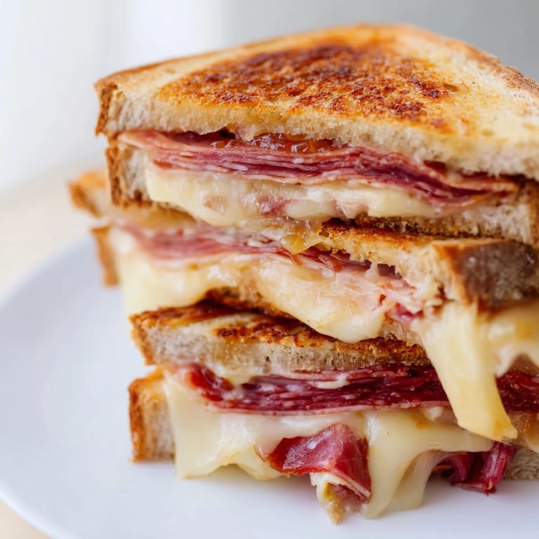 - Let the sandwich rest on a cutting board for exactly one minute—this prevents the melted cheese from pouring out when you slice, and it's just enough time for everything to set. Slice diagonally because it looks better and honestly tastes better too.
