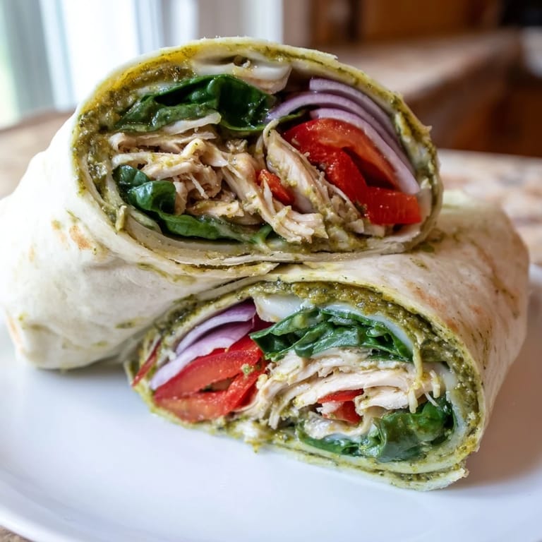 Save There's something magical about the moment you bite into a pesto chicken wrap—that first rush of basil hitting your palate, the warmth of the tortilla giving way to cool, crisp vegetables underneath. I discovered these wraps years ago when I was rushing between meetings, hungry and out of ideas, and I grabbed whatever looked green in the fridge. What started as a desperate afternoon lunch became my go-to solution for when I want something that tastes homemade but doesn't demand much time. Every wrap I make now reminds me of that moment of happy accident.
