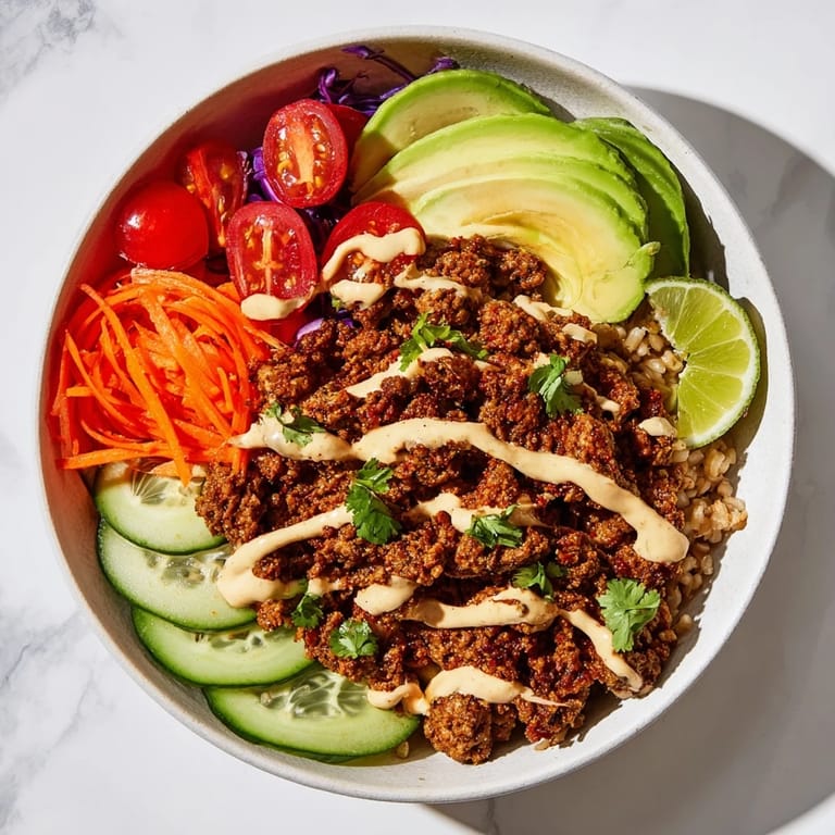 Save A vibrant, protein-packed bowl featuring plant-based meat alternatives, fresh vegetables, and bold, globally inspired seasonings. Perfect for a satisfying, wholesome meal.