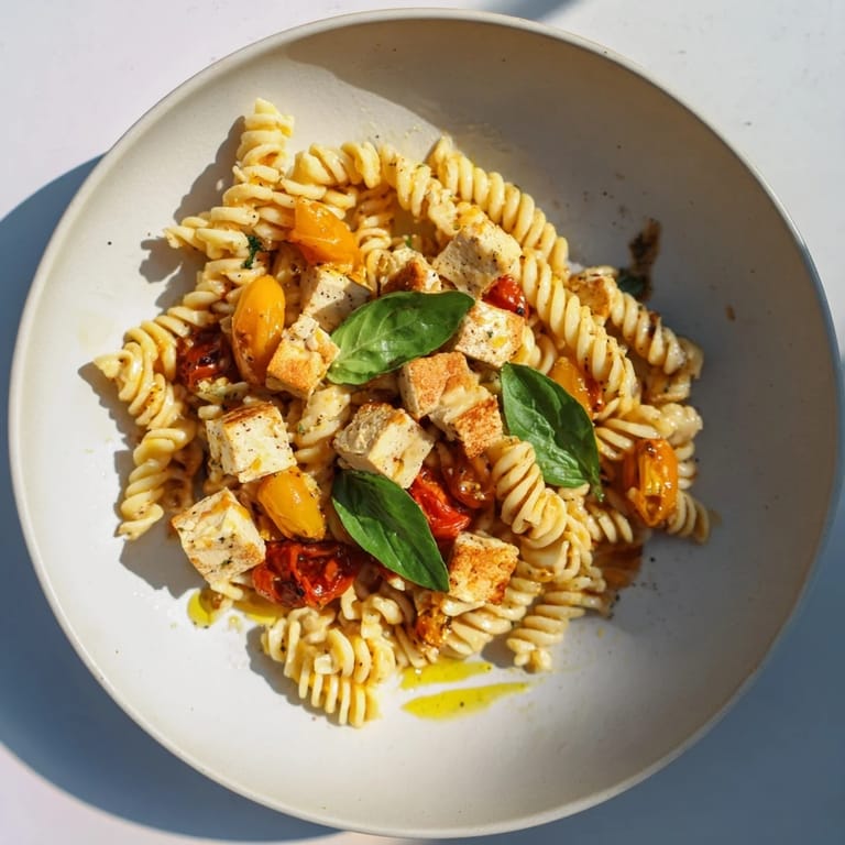 Save A creamy, savory vegan pasta featuring baked tofu as a feta-style cheese substitute, roasted tomatoes, and a silky sauce. Perfect for a hearty weeknight dinner.