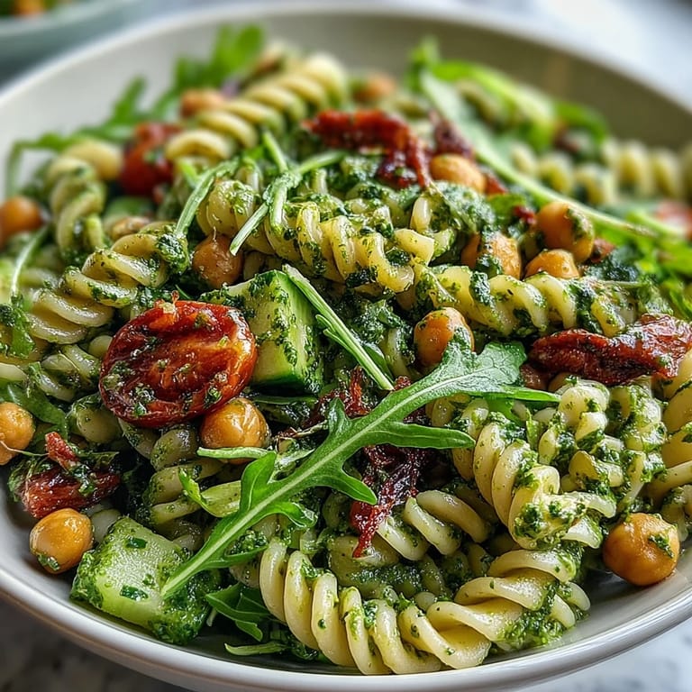 This recipe is a framework, not a prison sentence. I've made it with roasted red peppers when I wanted something warmer, with olives when I wanted more Mediterranean vibes, and with spinach instead of arugula when that's what I had in the drawer. One time I added some diced avocado right before serving and it was like eating a completely different salad—still itself, but richer and more luxurious. The foundation of creamy pesto and chickpea is strong enough to handle your experiments.